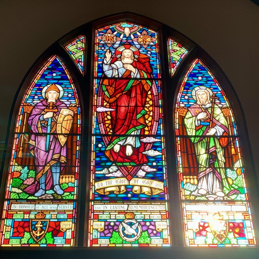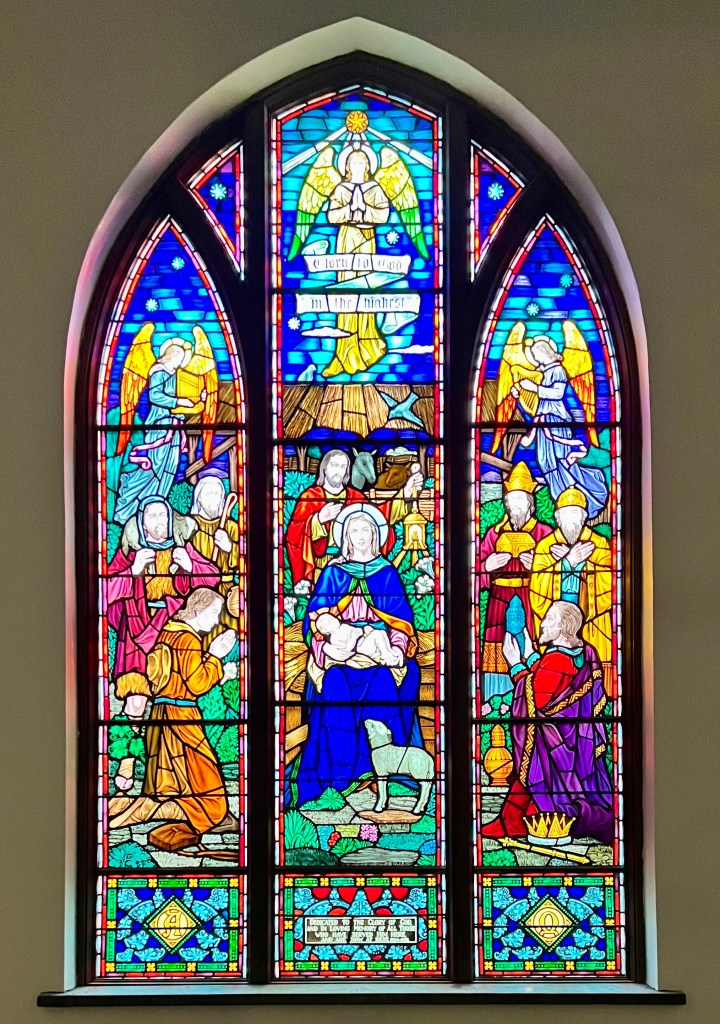 Meikle Stained Glass Studio of Toronto (and Glasgow) created the large east and west windows of the former church. These two stained-glass windows actually replaced the original stained glass windows after the two world wars to commemorate the men and women from the congregation who served and died in the conflicts. Saints Timothy and Philip flank the risen Christ in the east window, while the Nativity scene dominates the west window. The great west memorial window of Holy Trinity Church in Winnipeg has a similar Nativity scene by the Meikle Studio. William Meikle founded the Glasgow firm in 1838, and his grandson William Meikle III (1870-1953) established the studio in Toronto. The Glasgow firm also worked with the celebrated Scottish designer and architect, Charles Rennie McIntosh, whose stylistic influence can clearly be seen in the 24 Art Deco stainted glass windows of the church nave, installed in 1904.