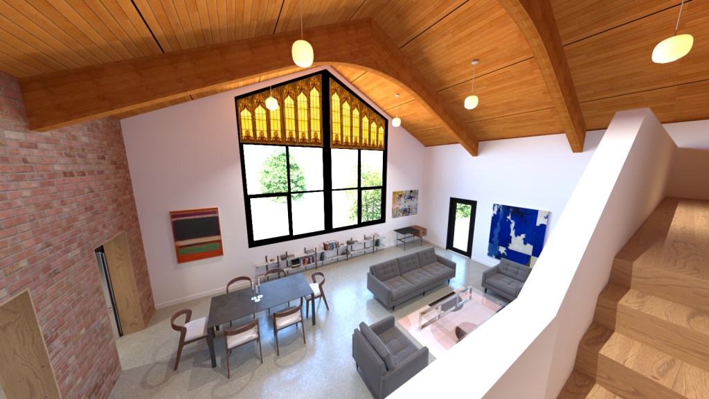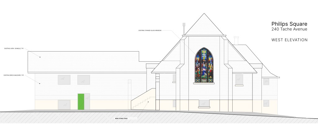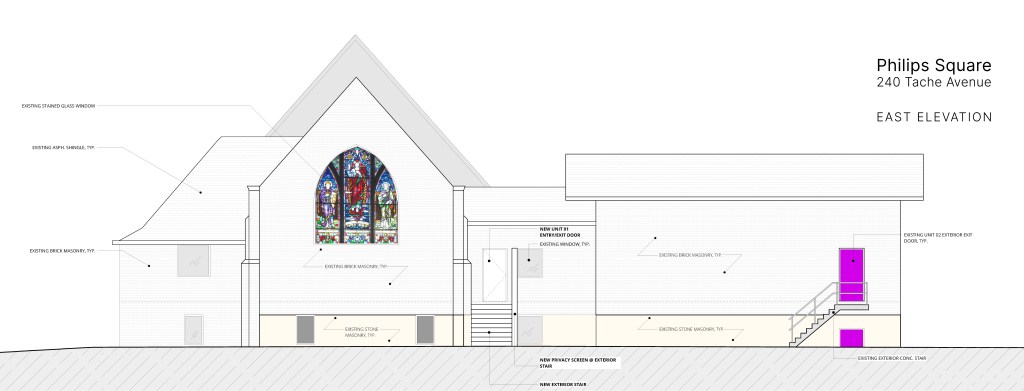For this historic adaptive reuse project, the footprint and facades of the 1904 historic St. Philip’s Church and 1959 memorial hall have been preserved, including the original stained glass windows, interior woodwork and finishings, and the red brick and tyndalstone facade and foundation. All along it was the owners’ intention to maintain and restore the existing facades and footprint of the former church and hall as part of the renovation and conversion project. This is a critical part of the exercise of adaptive reuse – saving, restoring, and reusing the building and its fabric through smart and sustainable adaptation. The restoration projection included the repointing and repair of the exterior brick and stone facade and foundation, and the revitalization of the gardens. As well, the old storm windows were replaced with energy efficient triple-glazed units, contributing to an improved HVAC system while protecting the historic stained glass windows. The newly drawn elevations of the two buildings celebrate 120 years of design, building, and community, and offer a new look at the splendid forms of limestone, brick, and stained glass.