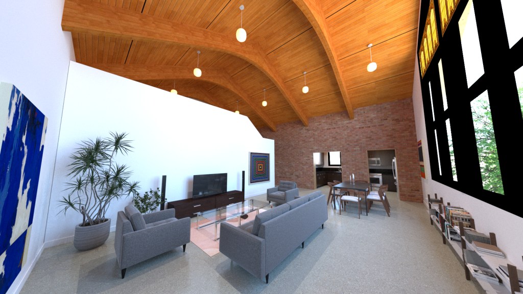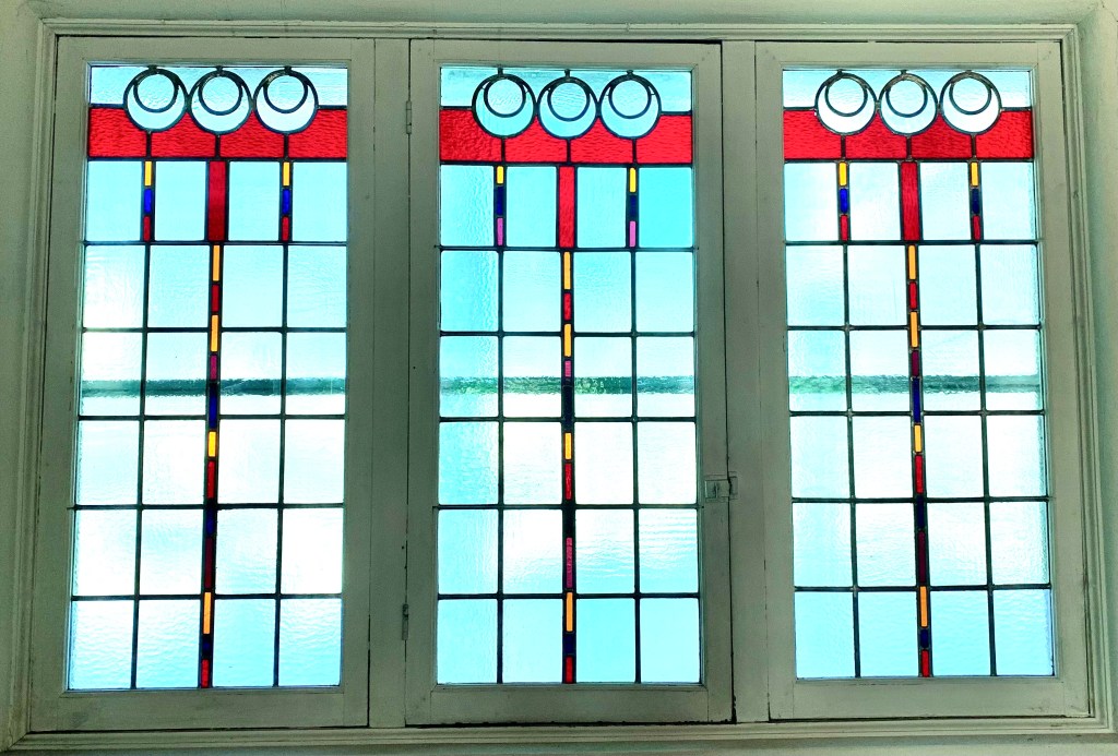 In the Memorial Hall, 12 reclaimed leaded glass lancet windows grace the upper register of the great north window Unit 2. These Art Deco windows were designed by Ford Brothers Studio for a church in Minneapolis, Minnesota, and date to 1920. The reconfiguration of the 12 lancet windows into two six-window oak framed windows was designed by Joshua Tollefson of JDT Stained Glass and Architecture Studio in St. Paul, Minnesota.