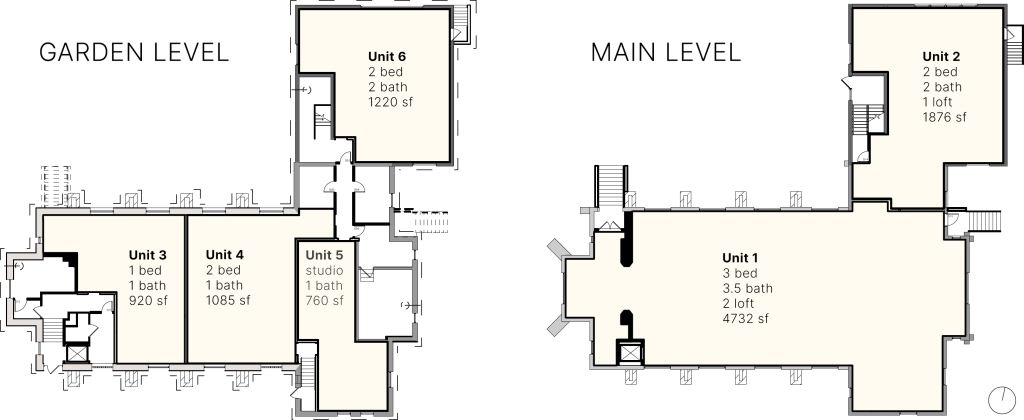 The light-filled apartments of Philips Square range in size from 760 sf to 4700 sf, and include studio, one, two, and three-bedroom units, including two with mezzanine dens. There are two residences on the main level and four residences on the garden level. Each residence has in suite laundry, individual HVAC units and storage space. Units 1, 2, and 6 have private gardens, and Units 3, 4, and 5 have access to a larger common garden and outdoor seating areas. Unit 1 has two enclosed parking stalls, and units 2-6 have assigned electrified surface parking stalls with access to one guest/accessible stall. All six apartments have custom-built triple-glazed high-performing, environmentally sustainable Reynaers windows systems fabricated by GRENS. Currently, all units are leased, with Unit 5 becoming available on November 1, 2025 and Unit 6 on December 15, 2025.