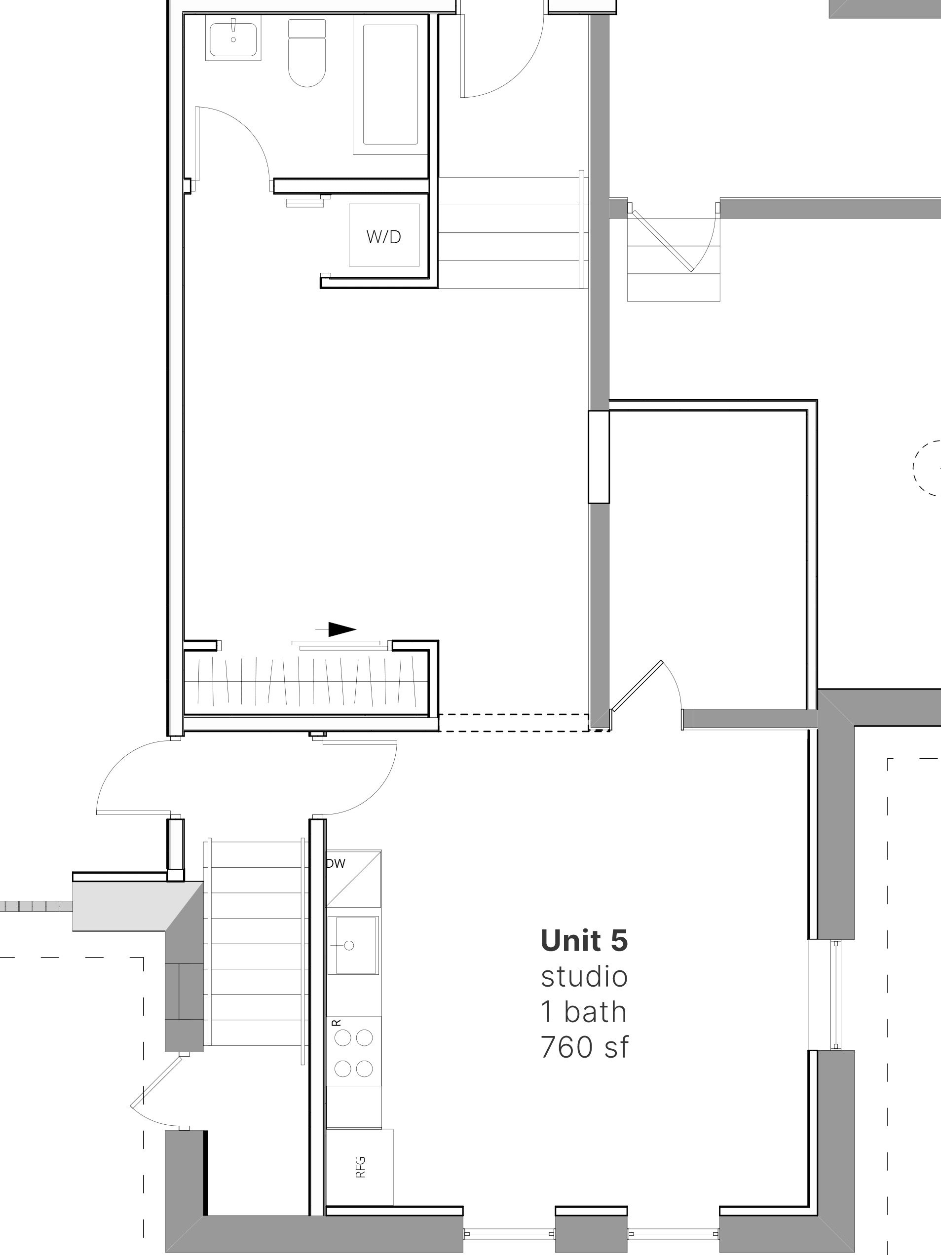 Unit 5 is 760 square feet and is an oversized studio apartment with 1 bath with titled tub/shower, open concept plan, windows on south and east elevations, polished concrete floors with exposed granite and limestone aggregate, 11’ ceiling, stainless steel appliances with induction stovetop and airfry oven, custom oak kitchen cabinets with black granite countertops and backsplash, eat-in island, recessed LED lighting throughout, in suite laundry, individual HVAC unit and storage space, central air, individual security system, high-speed internet, additional onsite storage room available, onsite storage room, custom-built triple-glazed high-performing Reynaers windows systems, front and rear entrances to apartment, access to large common garden and outdoor seating area, 1 assigned electrified surface parking spot.