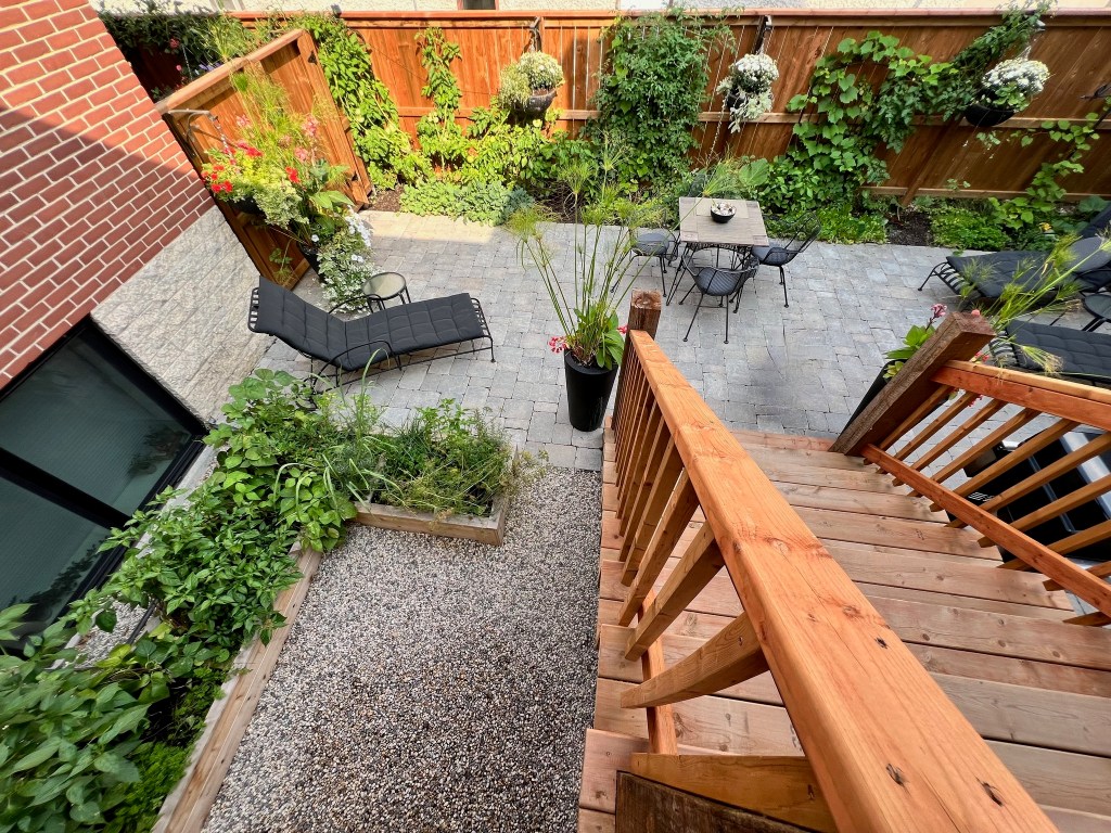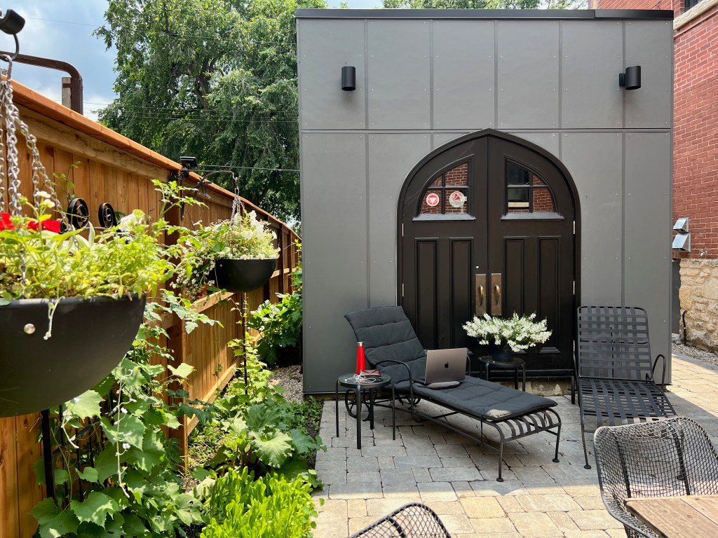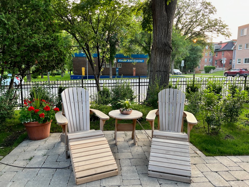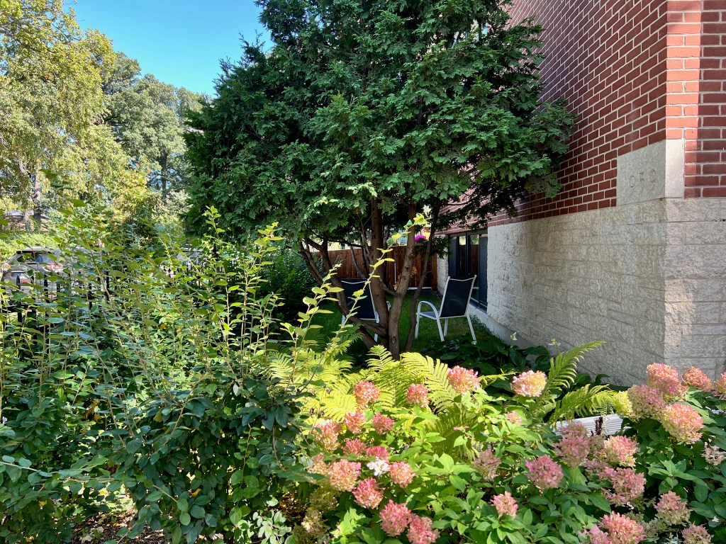 Since the restoration began in March 2022, the gardens have been an ongoing labour of love. Several century-old oak and elm trees have graced the site for generations. Recent additions include maple, pear, and spruce trees, a cotoneaster perimeter hedge, boulevard lily beds, and a series of flower gardens that include lilacs, hydrangeas, and roses. Three private garden spaces (for Unit 1, 2, and 6) on the east side of the property are paving stone and pea gravel bordered by grape vines and a wooden fence. The gardens are contemplative spaces, but also seek to be a sponge to help protect the three nearby rivers by reducing stormwater runoff. Click for larger views.